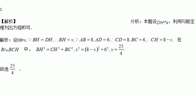 如图,矩形ABCD中,AB=8,AD=6,将矩形ABCD绕点B按顺时针方向旋转后得到矩形A′BC′D′.若边A′B交线段CD于H,且BH=DH,则DH的值是( )