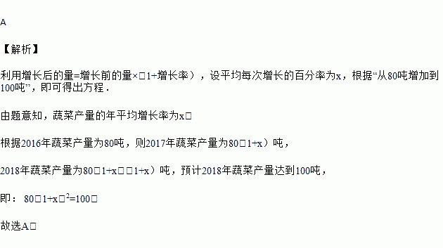 某种植基地2016年蔬菜产量为80吨,预计2018年蔬菜产量达到100吨,求蔬菜产量的年平均增长率,设蔬菜产量的年平均增长率为x,则可列方程为( )