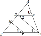 分析:根据同位角相等,两直线平行可得DE∥BC,再根据两直线平行,内错角相等可得∠2=∠4,然后求出∠3=∠4,再根据同位角相等,两直线平行判断出CD∥FH,然后求解即可.