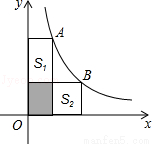 上,分别经过A、B两点向轴作垂线段,已知S阴影=1,则S1+S2=( )