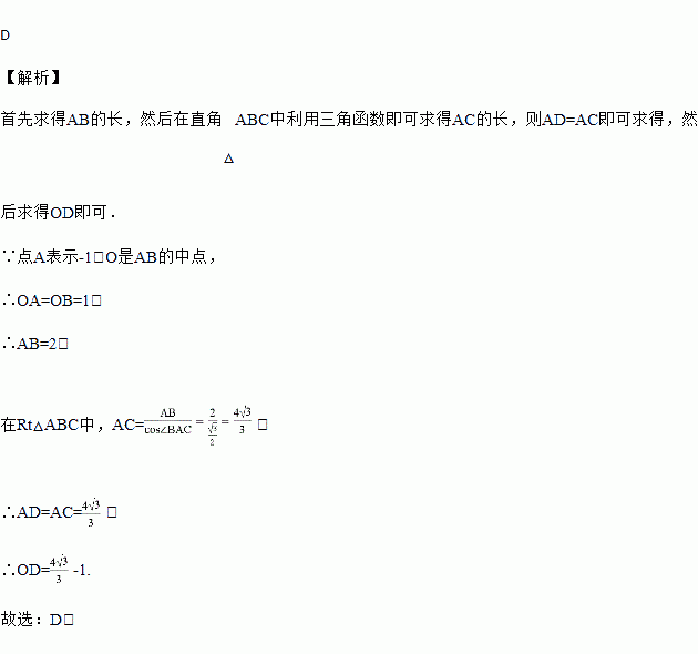 如图,数轴上点A表示的数是-1,原点O是线段AB的中点,∠BAC=30,∠ABC=90°,以点A为圆心,AC长为半径画弧,交数轴于点D,则点D表示的数是