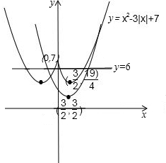 当x2-3x≤0时,0<x<3,y=6,图象与函数y=x2-3|x|+7=6有四个交点,符合0<x<3图象交点有2个交点;