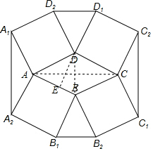 分析 连接AC,BD,根据菱形的性质得到AD=AB=CD=BC,∠DAB+∠ADC=180°,根据正方形的性质得到AA1=AA2=AD=AB=DD2=DD1,∠A2AB=∠A1AD=∠D1DC=90°,推出△A1AA2≌△ADC,同理△2CC1≌△ADC,△B1BB2≌△ADB≌△D1DD2,于是得到S${\;}_{正方形{A}_{1}AD{D}_{2}}$=2S菱形ABCD,过D作DE⊥AB与E,设菱形的边长为a,得到DE=$\frac{1}{2}$AD,求得∠DAB=30°,得到∠ADC=150°,于是得到结论.