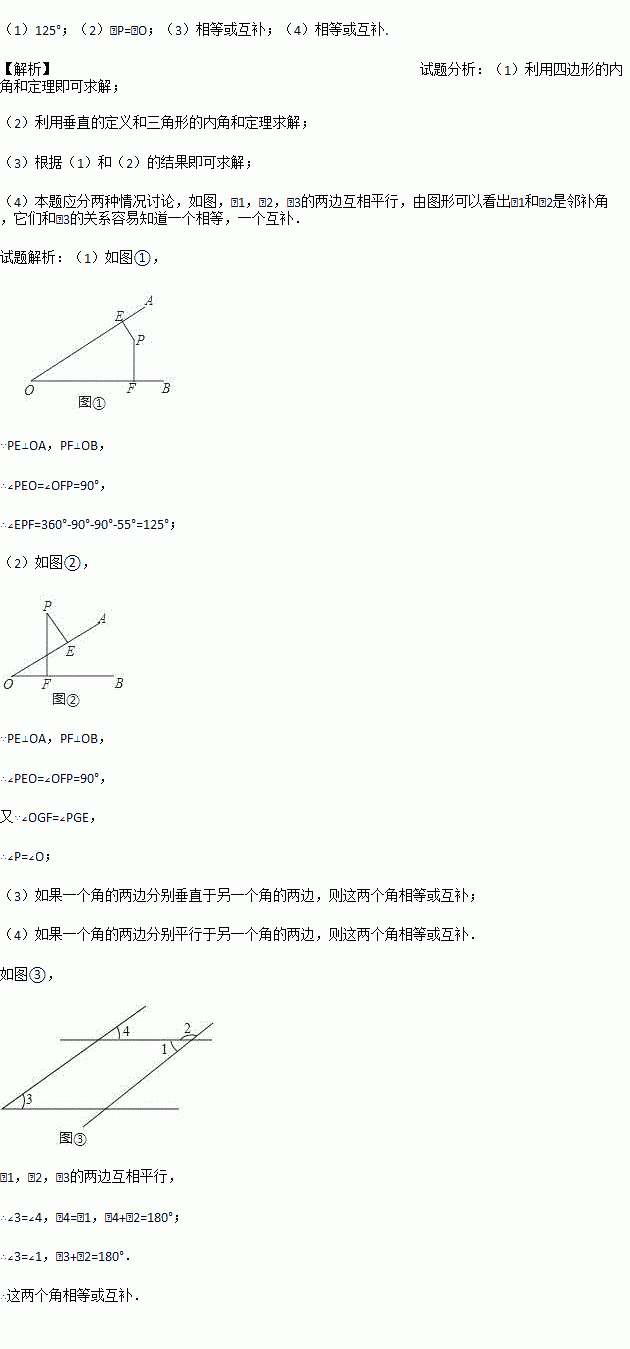 (1)图①中,∠AOB=55°,点P在∠AOB内部,过点P作PE⊥OA,PF⊥OB,垂足分别为E、F,求∠EPF的度数。