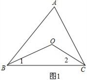 分析 (1)如图1,根据角平分线的定义得到∠1=$\frac{1}{2}$∠ABC,∠2=$\frac{1}{2}$∠ACB,在根据三角形内角和定理得∠BOC=180°-∠1-∠2,则∠BOC=180°-$\frac{1}{2}$(∠ABC+∠ACB),由于∠ABC+∠ACB=180°-∠A,所以∠BOC=90°+$\frac{1}{2}$∠A;