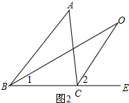 (2)根据角平分线的定义得∠1=$\frac{1}{2}$∠ABC,∠2=$\frac{1}{2}$∠ACE,再利用三角形外角性质得∠2=∠1+∠O,∠ACE=∠ABC+∠A,由于$\frac{1}{2}$∠ACE=$\frac{1}{2}$∠ABC+∠0,则∠A=2∠O,即∠O=$\frac{1}{2}$∠A.