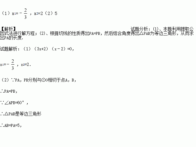 (2)如图,PA,PB分别与相⊙O切于点A,B,连接AB.∠APB=60°,AB=5,求PA的长.