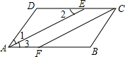 (2)首先根据平行四边形的性质可得∠DAB=∠DCB,CD∥AB,再根据角平分线的性质可得∠3=∠ECF,再证明AE∥CF,根据两组对边分别平行的四边形是平行四边形可证明四边形AECF为平行四边形.