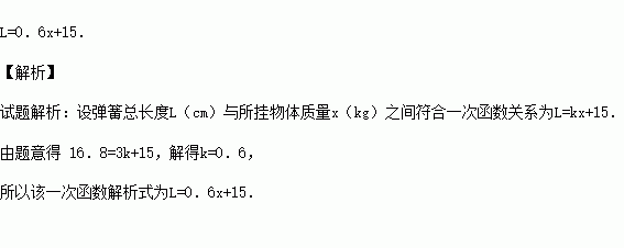 在弹性限度内,弹簧伸长的长度与所挂物体的质量呈正比,某弹簧不挂物体时长15cm,当所挂物体质量为3kg时,弹簧长16.8cm.写出弹簧长度L(cm)与所挂物体质量x(kg)之间的函数表达式 .