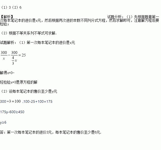 (2)若要求这两次购进的笔记本按同一价格全部销售完毕后获利不低于450元,问每本笔记本的售价至少是多少元?