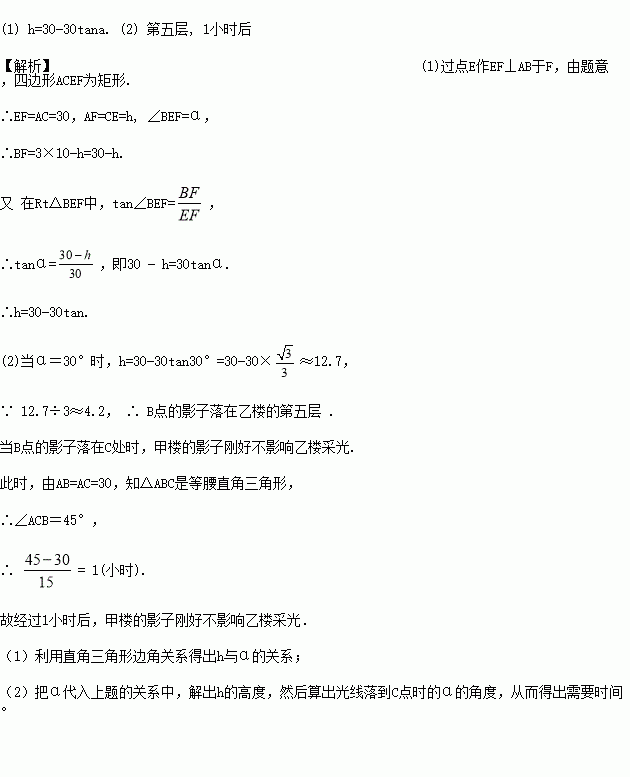 (2) 当α=30°时,甲楼楼顶B点的影子落在乙楼的第几层?若α每小时增加15°,从此时起几小时后甲楼的影子刚好不影响乙楼采光 ?