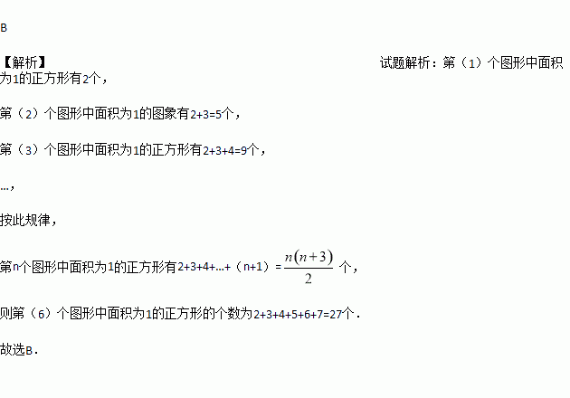 如图,下列图形都是由面积为1的正方形按一定的规律组成,其中,第(1)个图形中面积为1的正方形有2个,第(2)个图形中面积为1的正方形有5个,第(3)个图形中面积为1的正方形有9个,…,按此规律.则第(6)个图形中面积为1的正方形的个数为( )