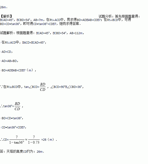钟楼是云南大学的标志性建筑之一,某校教学兴趣小组要测量钟楼的高度,如图,他们在点A处测得钟楼最高点C的仰角为45°,再往钟楼方向前进至点B处测得最高点C的仰角为54°,AB=7m,根据这个兴趣小组测得的数据,计算钟楼的高度CD.(tan36°≈0.73,结果保留整数).