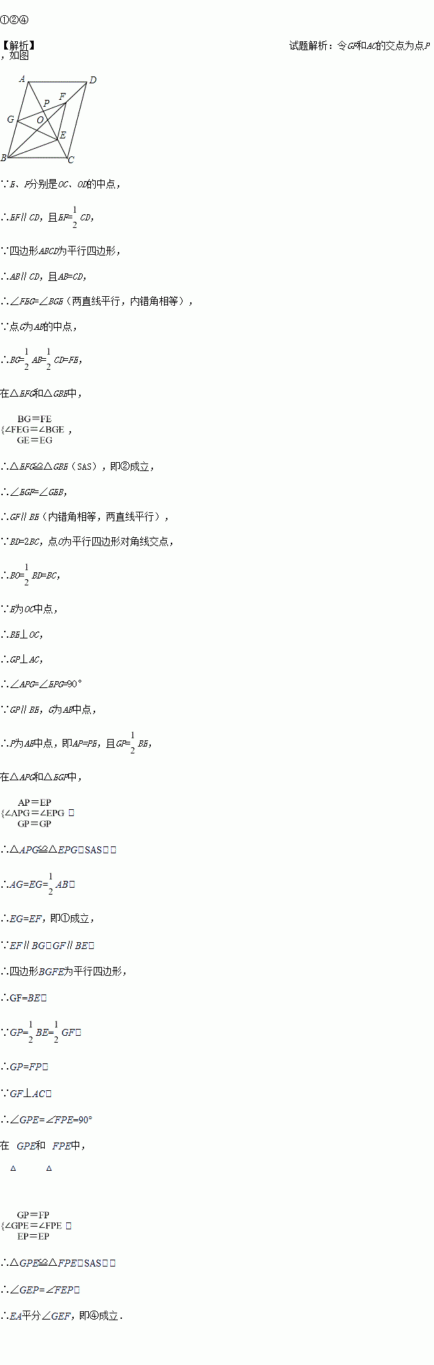 平行四边形ABCD中,对角线AC、BD相交于点O,BD=2AD,E、F、G分别是OC、OD,AB的中点.下列结论:①EG=EF; ②△EFG≌△GBE; ③FB平分∠EFG;④EA平分∠GEF;⑤四边形BEFG是菱形.
