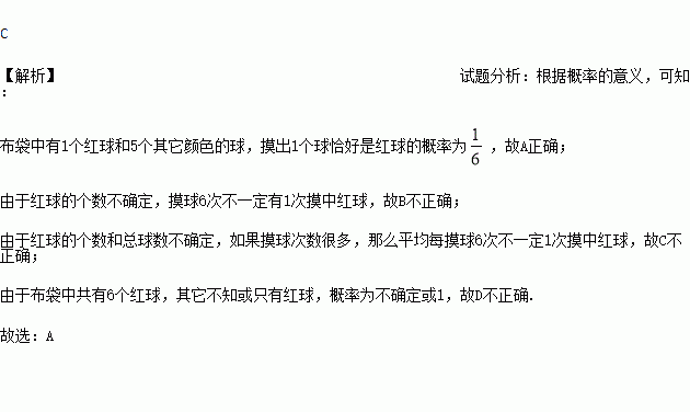 C. 如果摸球次数很多,那么平均每摸球6次就有1次摸中红球