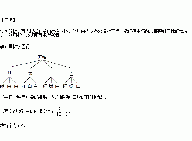 (2014•防城港)一个盒子内装有大小、形状相同的四个球,其中红球1个、绿球1个、白球2个,小明摸出一个球不放回,再摸出一个球,则两次都摸到白球的概率是( )