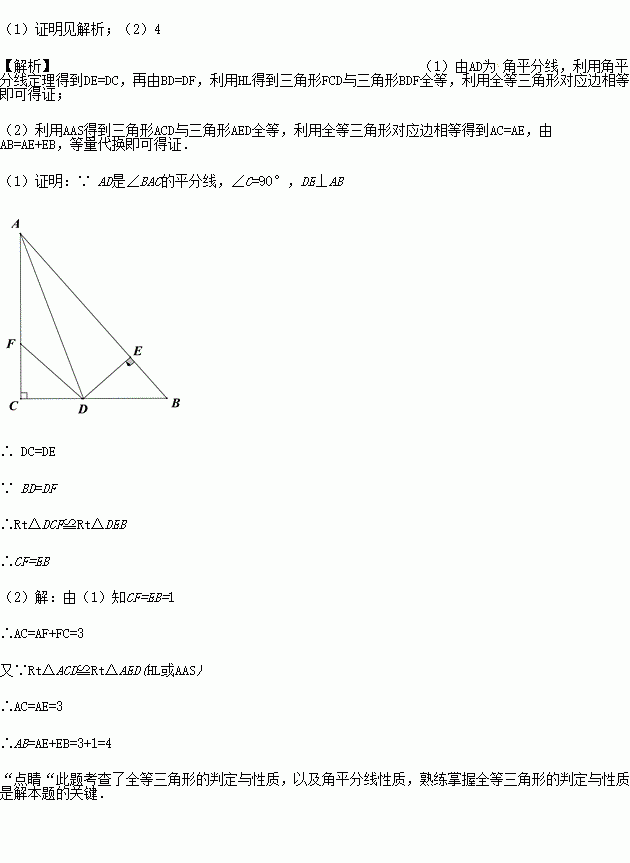 如图:在△ABC中,∠C=90°,AD是∠BAC的平分线,DE⊥AB于E,F在AC上,BD=DF.