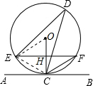 分析:如图,连接OE,CE,由EF∥AB得到∠F=∠BCF,由圆周角定理知∠F=∠D=30°,然后可以推出∠BCF=∠D=30°;而根据切线的性质知道∠OCB=90°,进一步得到∠OCF=60°,从而得到∠CEF=∠BCF=30°,由此推出∠CEF=∠F,点C是弧ECF的中点,所以根据垂径定理得到OC⊥EF,