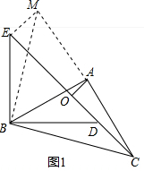 ②延长CA至M,使AM=AC,连接BM、EM,证明△EBM≌△DBC,得到CD=EM,根据三角形中位线定理证明AO=$\frac{1}{2}$EM,得到答案;