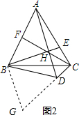 (2)根据∠ADB=∠ADC,于是得到∠BDC=180°-∠BAC=120°,求得∠BDH=60°,根据已知条件得到∠DBH=30°,由直角三角形的性质得到DH=$\frac{1}{2}$BD=2,推出△FBC≌△ABE,根据全等三角形的性质得到∠BCF=∠ABE.由于∠BHF=∠BCF+∠CBH=∠ABE+∠CBH=60°,于是得到∠CHD=30°=∠DBH推出∠DCH=90°,根据直角三角形的性质得到CD=$\frac{1}{2}$DH=1,延长CD到G,使DG=DB=4,连接BG.于是得到△BDG为等边三角形,根据等边三角形的性质得到BG=BD,根据等腰三角形的性质得到∠GBD=∠CBA=60°,证得△GBC≌△DBA,根据全等三角形的性质即可得到结论.