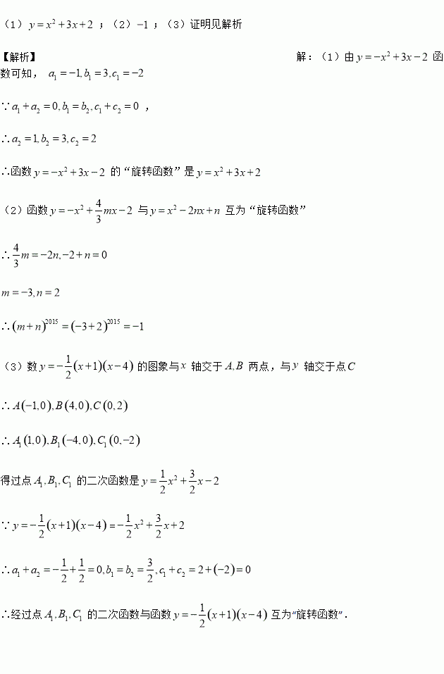 函数可知a1=-1,b1=3,c1=-3,根据a1+a2=0,b1=b2,c1+c2=0求出a2,b2,c2,就能确定这个函数的“旋转函数”.