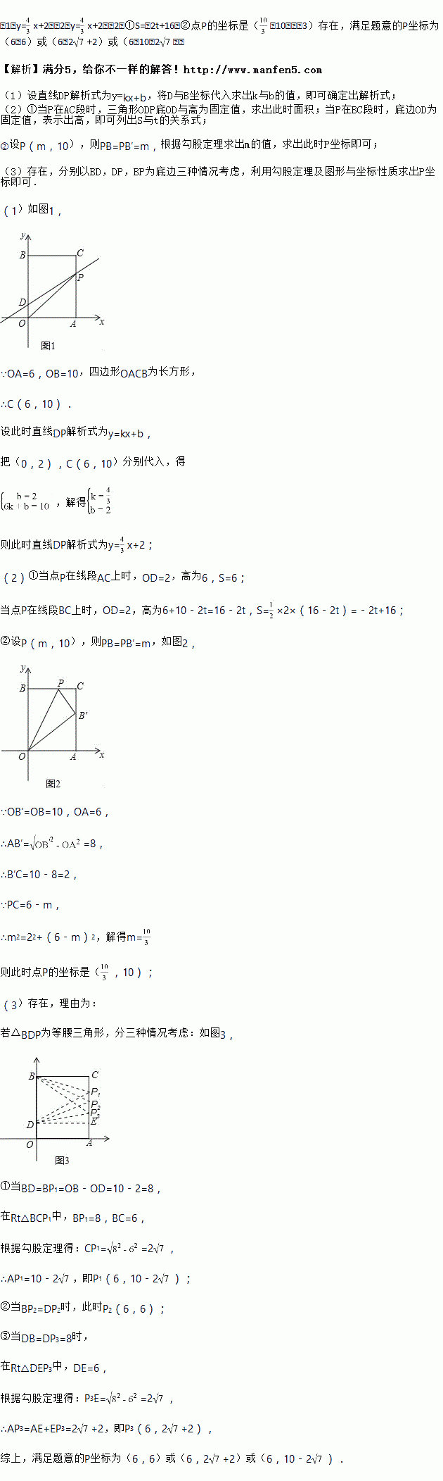 如图 1,在平面直角坐标系中,O 是坐标原点,长方形 OACB 的顶点 A、B 分别在 x 轴与 y 轴上,已知 OA=6,OB=10.点 D 为 y 轴上一点,其坐标为(0,2), 点 P 从点 A 出发以每秒 2 个单位的速度沿线段 AC﹣CB 的方向运动,当点 P 与点 B 重合 时停止运动,运动时间为 t 秒.