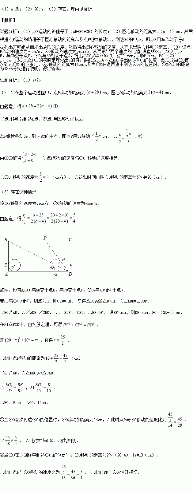 Èçͼ£¬ÔÚ¾ØÐÎABCDÖУ¬AD=acm£¬AB=bcm£¨a£¾b£¾4£©£¬°ë¾¶Îª2cmµÄ¡ÑOÔÚ¾ØÐÎÄÚÇÒÓëAB¡¢AD¾ùÏàÇУ®ÏÖÓж¯µãP´ÓAµã³ö·¢£¬ÔÚ¾ØÐαßÉÏÑØ×ÅA¡úB¡úC¡úDµÄ·½ÏòÔÈËÙÒÆ¶¯£¬µ±µãPµ½´ïDµãÊ±Í£Ö¹ÒÆ¶¯£»¡ÑOÔÚ¾ØÐÎÄÚ²¿ÑØADÏòÓÒÔÈËÙÆ½ÒÆ£¬Òƶ¯µ½ÓëCDÏàÇÐʱÁ¢¼´ÑØÔ·°´ÔËÙ·µ»Ø£¬µ±¡ÑO»Øµ½³ö·¢Ê±µÄλÖ㨼´ÔÙ´ÎÓëABÏàÇУ©Ê±Í£Ö¹Òƶ¯£®ÒÑÖªµãPÓë¡ÑOͬʱ¿ªÊ¼Òƶ¯£¬Í¬Ê±Í£Ö¹Òƶ¯£¨¼´Í¬Ê±µ½´ï¸÷×ÔµÄÖÕֹλÖã©£®
