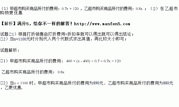 (2)当x=1100时,试比较顾客到哪家超市购物更加优惠.