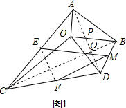 分析 (1)连接AD、BC,由∠AOB=∠COD=90°∠ABO=∠DCO=30°,得到$\frac{OA}{OB}=\frac{OD}{OC}=\frac{\sqrt{3}}{3}$,∠AOD=∠BOC,推出△AOD∽△BOC,求得∠OAD=∠CBO,$\frac{AD}{BC}=\frac{\sqrt{3}}{3}$,证得AD⊥BC由于点E、F、M分别是AC、CD、DB的中点,根据三角形的中位线的性质得到EF∥AD,EF=$\frac{1}{2}$AD,于是得到MF∥AD,MF=$\frac{1}{2}$AD,在Rt△EFM中,$\frac{FM}{EM}$=$\frac{\sqrt{3}}{2}$;