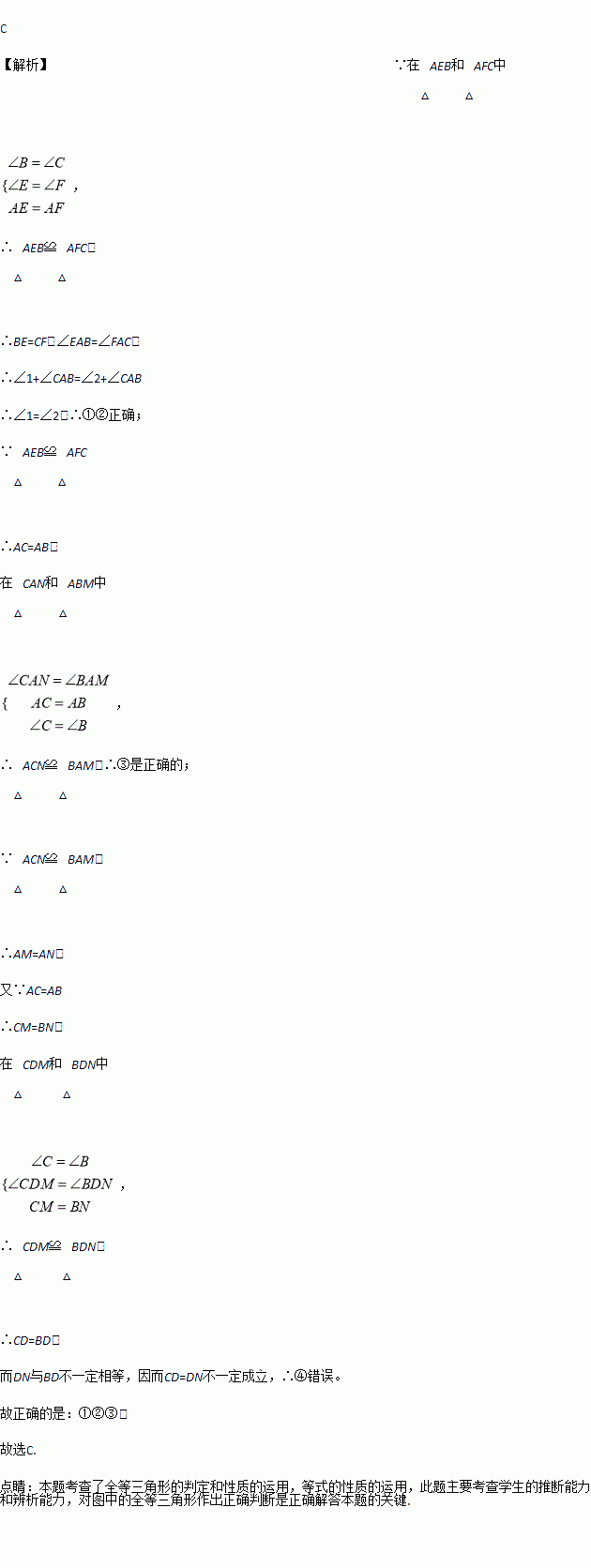 ①∠1=∠2;②BE=CF;③△ACN≌△ABM;④CD=DN.
