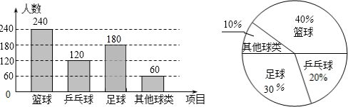 分析 (1)首先根据条形统计图和扇形统计图,用喜欢篮球的人数除以它占参加调查的人数的百分率,求出参加调查的人数共有多少人;然后在扇形图中,用1减去喜欢篮球、乒乓球和其它球类的学生占的百分率,求出m的值是多少,并将条形图补充完整即可.