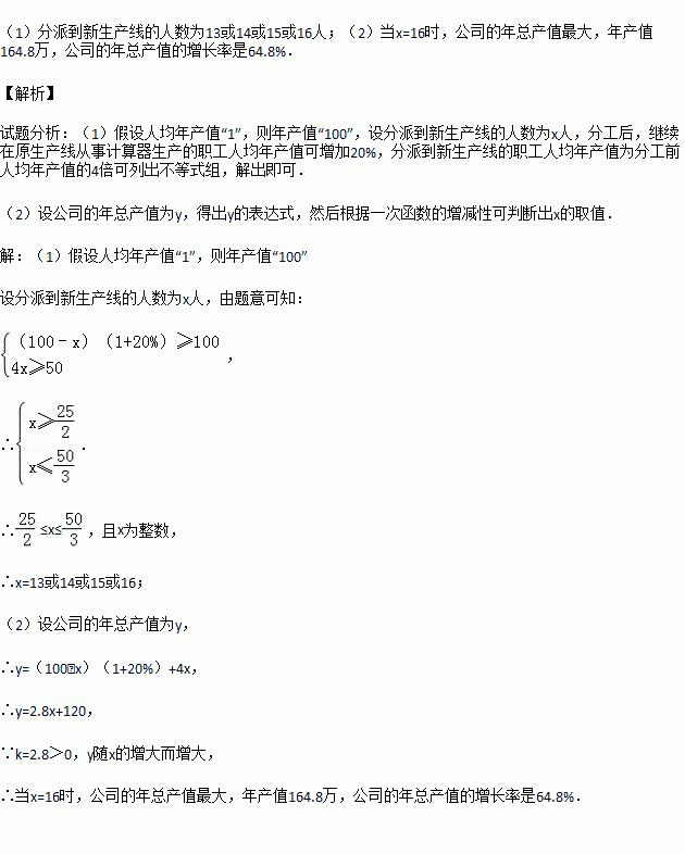某生产“科学记算器”的公司,有100名职工,该公司生产的计算器由百货公司代理销售,经公司多方考察,发现公司的生产能力受到限制.决定引进一条新的计算器生产线生产计算器,并从这100名职工中选派一部分人到新生产线工作.分工后,继续在原生产线从事计算器生产的职工人均年产值可增加20%,而分派到新生产线的职工人均年产值为分工前人均年产值的4倍,如果要保证公司分工后,原生产线生产计算器的年总产值不少于分工前公司生产计算器的年总产值,而新生产线生产计算器的年总产值不少于分工前公司生产计算器的年总产值的一半.