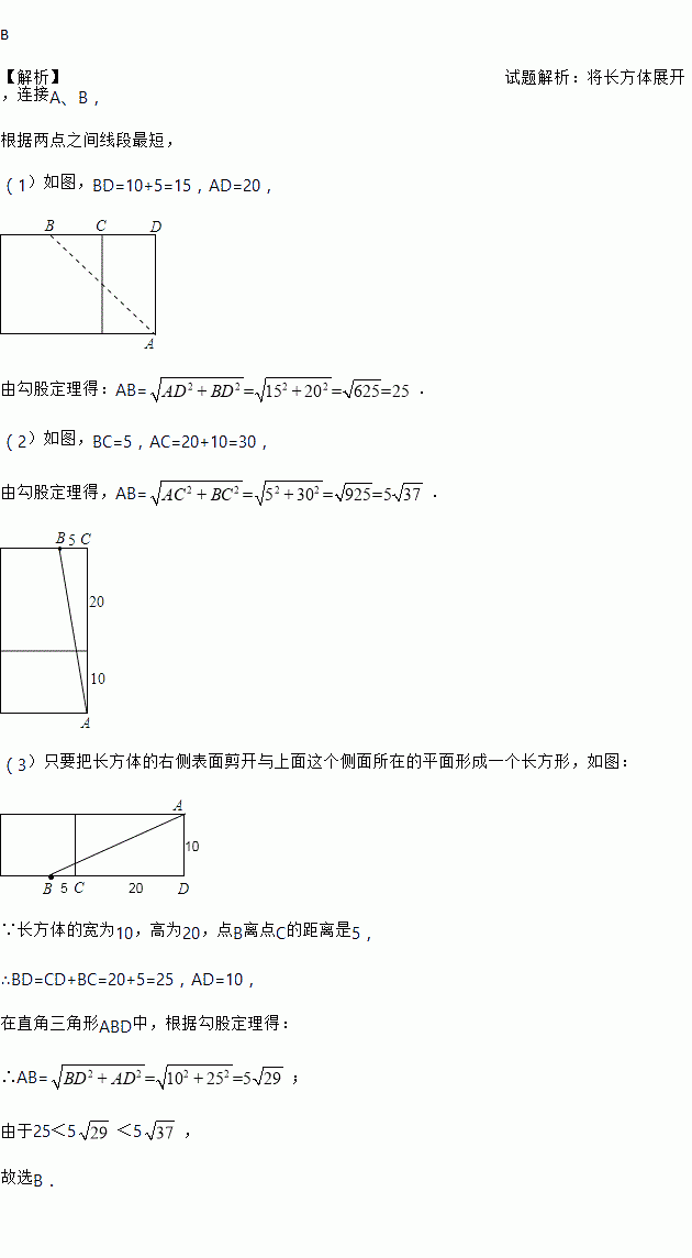 如图,长方体的长为15宽为10,高为20,点B离点C的距离为5,一只蚂蚁如果要沿着长方体的表面从点A爬到点B,需要爬行的最短距离是( )