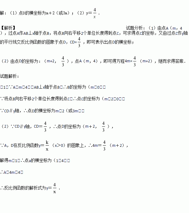 (x>0)的图象上有一点A(m,4),过点A作AB⊥x轴于点B,将点B向右平移2个单位长度得到点C,过点C作y轴的平行线交反比例函数的图象于点D,CD=