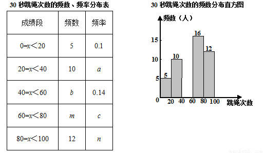 某校为迎接体育中考,了解学生的体育情况,学校随机调查了本校九年级50名学生“30秒跳绳”的次数,并将调查所得的数据整理如下: