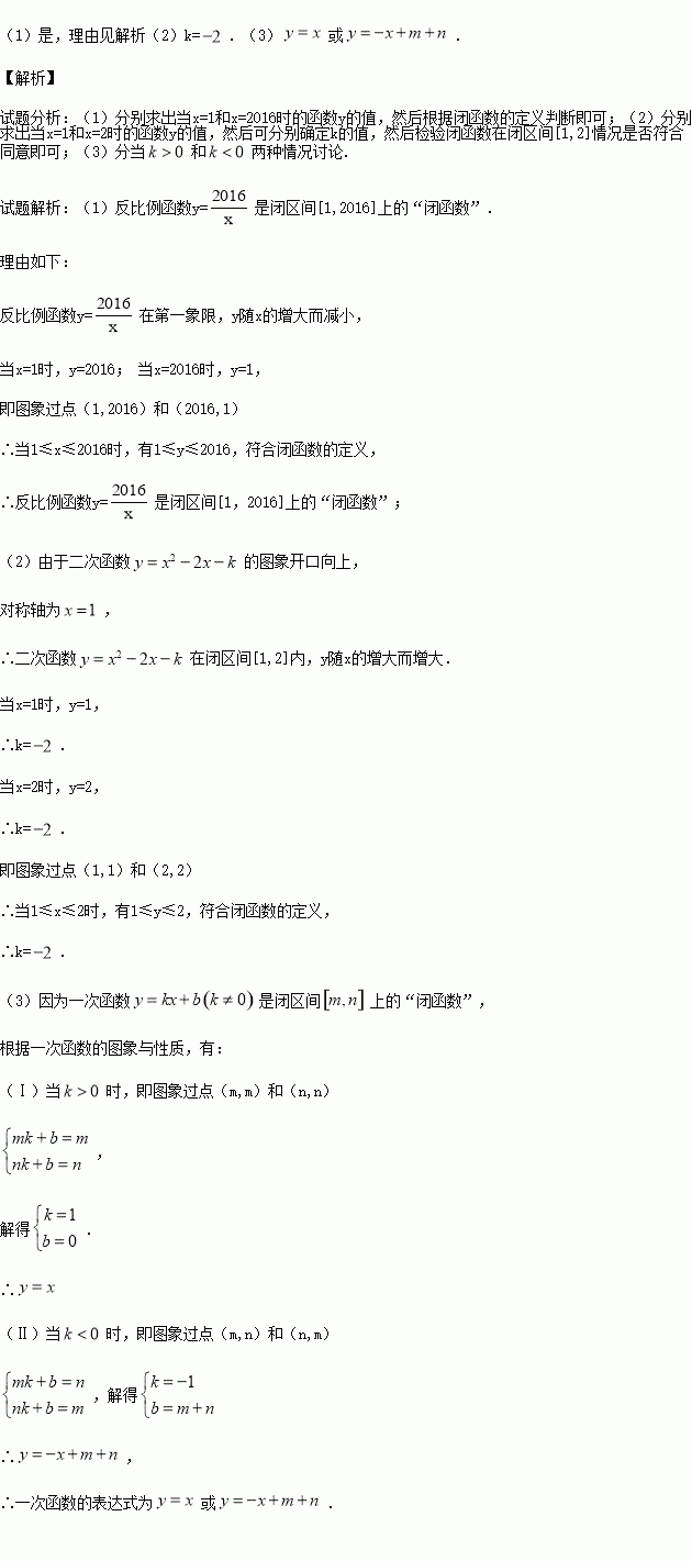 (3)若一次函数y=kx+b(k≠0)是闭区间[m,n]上的“闭函数”,求此函数的表达式(用含m,n的代数式表示).