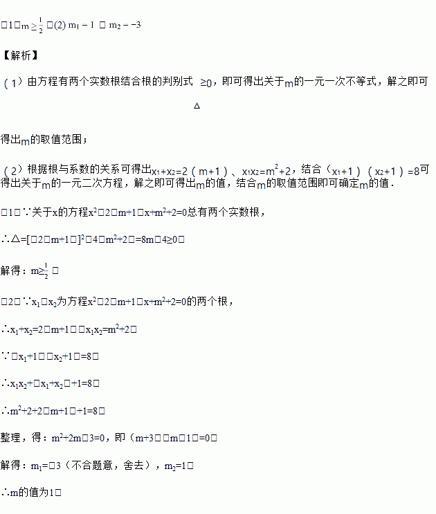 (2)若两实数根x1、x2满足(x1+1)(x2+1)=8,求m的值.