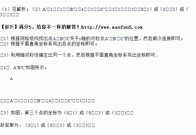 (1)画出△ABC关于y轴对称的△A′B′C′(其中A′,B′,C′分别是A,B,C的对应点,不写画法);