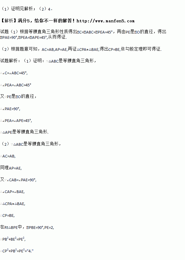 如图,已知等腰直角三角形ABC,点P是斜边BC上一点(不与B,C重合),PE是△ABP的外接圆⊙O的直径.