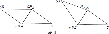 解答 解:由题意可得,(1)变化后,如图,有可能△ADC的边AD与CB重合得到四边形;(2)变化后,如图2,有可能△ADC的边DC与AB重合得到四边形;(3)变化后,如图3,有可能△ADC的边AC与CA重合得到四边形;故选:D.