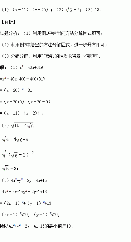(2014秋•香洲区期末)所谓配方,就是把一个多项式经过适当变形配成完全平方式.配方法除一元二次方程求根公式推导这一典型应用外,在因式分解、化简二次根式、证明恒等式、解方程、求代数式最值等问题中都有广泛应用.是一种很重要、很基本的数学方法.如以下例1,例2: