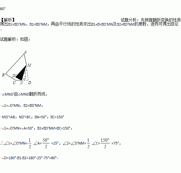 如图①,一张四边形纸片ABCD,∠A=50°,∠C=150°.若将其按照图②所示方式折叠后,恰好MD′∥AB,ND′∥BC,则∠D的度数为 .