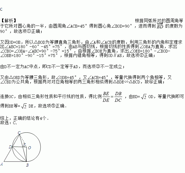 如图,在锐角△ABC中,∠A=60°,∠ACB=45°,以BC为弦作⊙O,交AC于点D,OD与BC交于点E,若AB与⊙O相切,则下列结论: