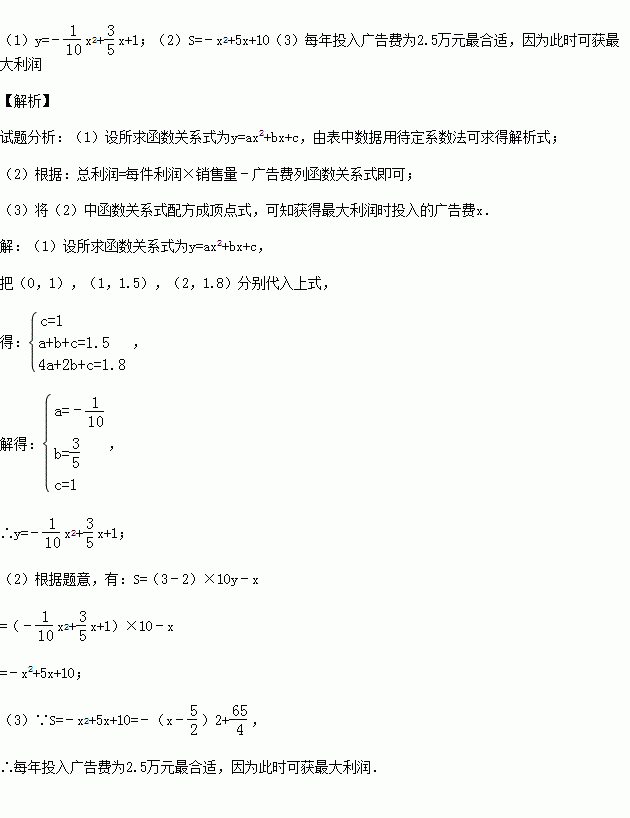 某公司生产的A种产品,每件成本是2元,每件售价是3元,一年的销售量是10万件.为了获得更多的利润,公司准备拿出一定资金来做广告.根据经验,每年投入的广告费为x(万元)时,产品的年销售量是原来的y倍,且y是x的二次函数,公司作了预测,知x与y之间的对应关系如表: