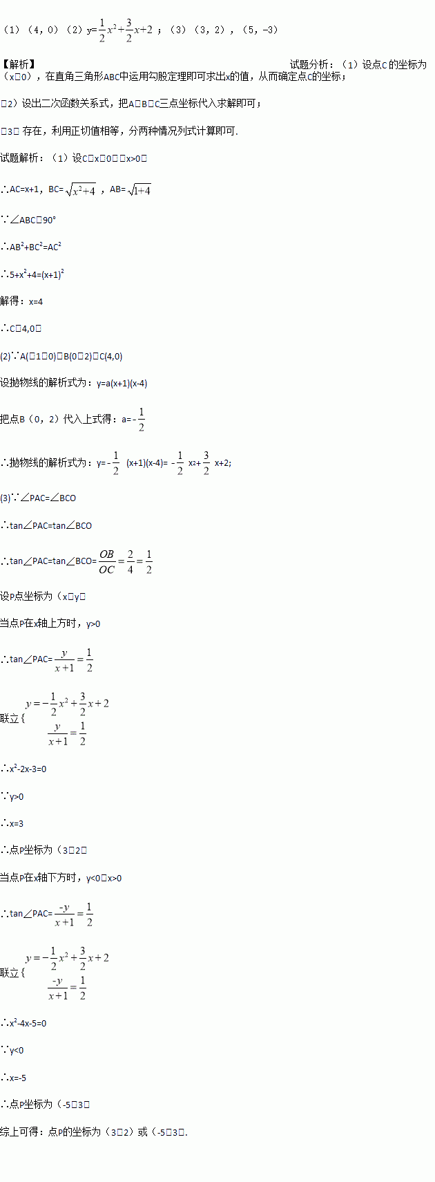 (3)在(2)中的抛物线上是否存在点P,使∠PAC=∠BCO?若存在,求出点P的坐标;若不存在,说明理由.