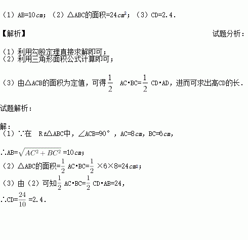 如图,在 Rt△ABC中,∠ACB=90°,AC=8cm,BC=6cm,CD⊥AB于D,求: