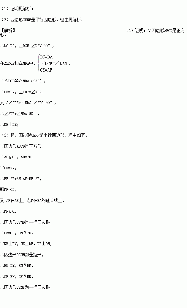 如图,四边形ABCD是正方形,点E,F分别在BC,AB上,点M在BA的延长线上,且CE=BF=AM,过点M,E分别作NM⊥DM,NE⊥DE交于N,连接NF.