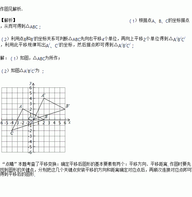 (2)若将(1)中的△ABC平移,使点B的对应点B′坐标为(6,2),画出平移后的△A′B′C′;