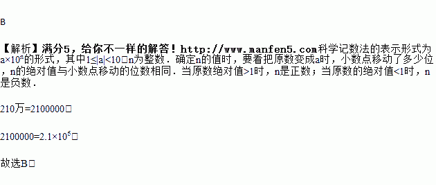 随着我国综合国力的提升,中华文化影响日益增强,学中文的外国人越来越多,中文已成为美国居民的第二外语,美国常讲中文的人口约有210万,请将“210万”用科学记数法表示为( )