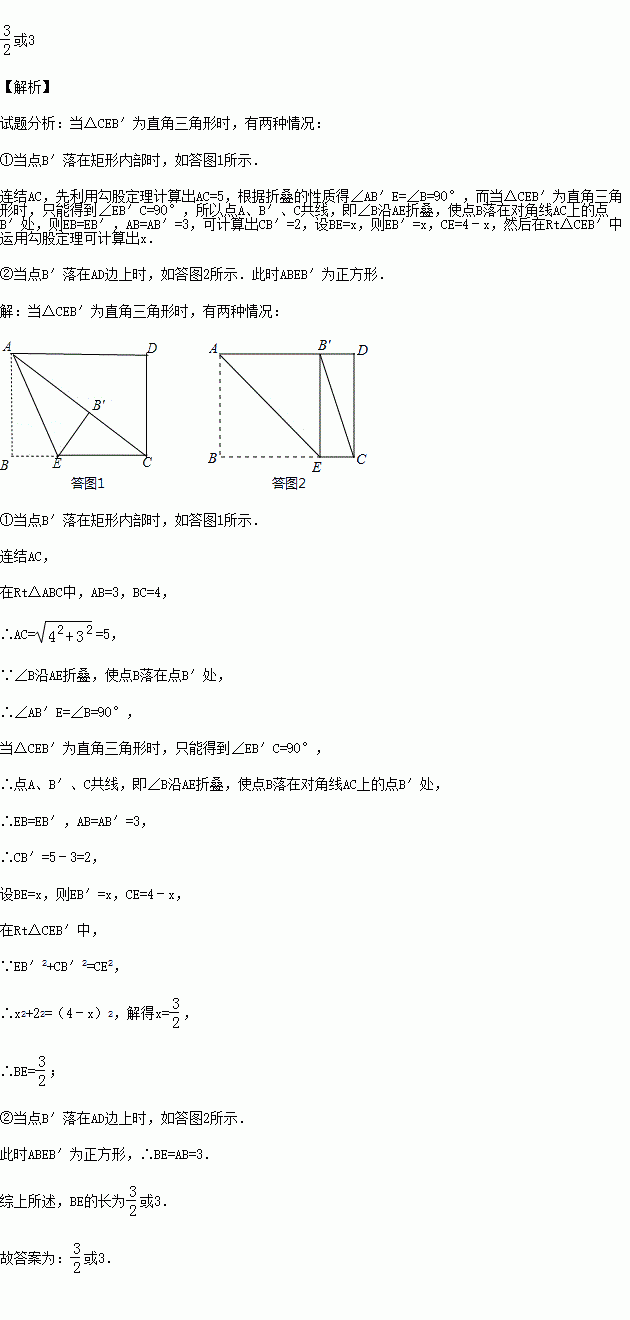 如图,矩形ABCD中,AB=3,BC=4,点E是BC边上一点,连接AE,把∠B沿AE折叠,使点B落在点B′处.当△CEB′为直角三角形时,BE的长为 .